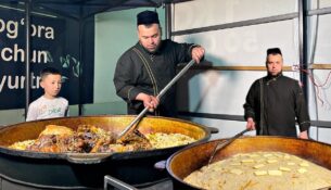Плов со свининой в казане дома на плите. Подробное описание....