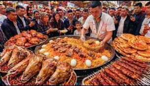 • Insane China Border Food Market! Massive Mountains of Lamb Heads, Roasted Chicken Feast in Xinjiang